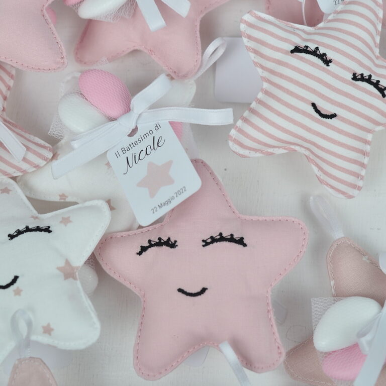 Bomboniera completa con Fiocchetto in tulle. Comprende: Stellina cotone – visino ricamato- gancetto o calamita- tulle e nastrino in raso, biglietto personalizzato e confetti nr. 5 gusto mandorla o cioccolato.
