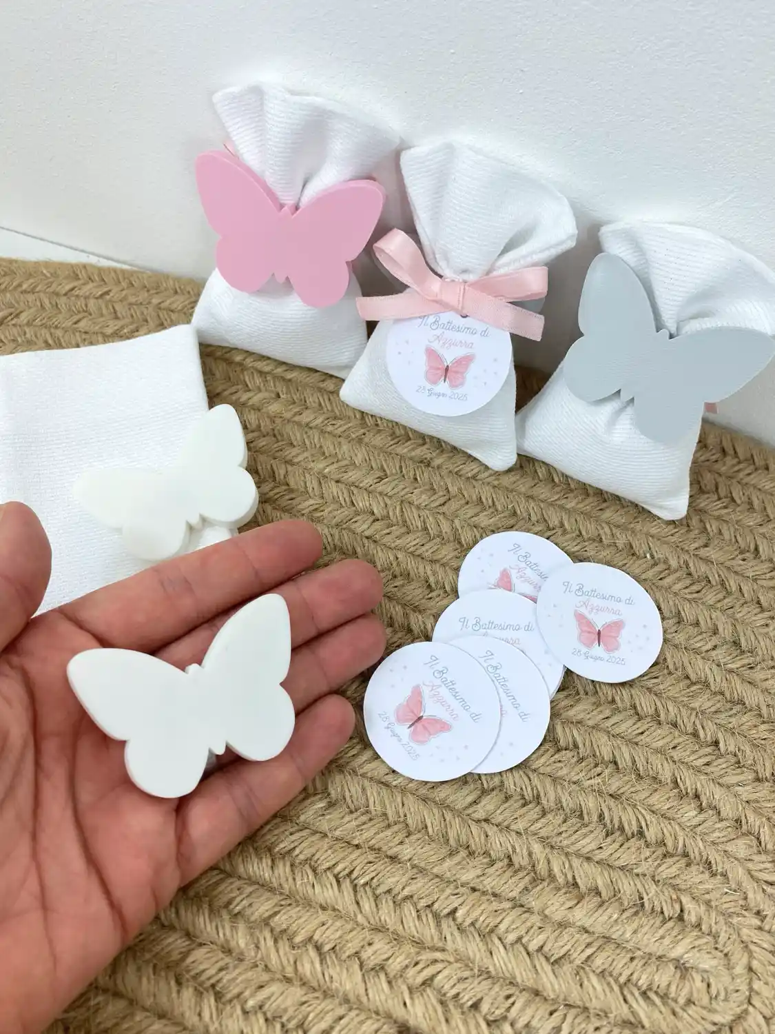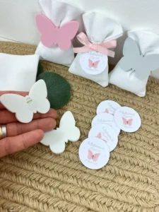 Applicazione 3D: A scelta tra Farfalla, Margherita o Elefantino, realizzata in PLA ecologico in colori pastello.