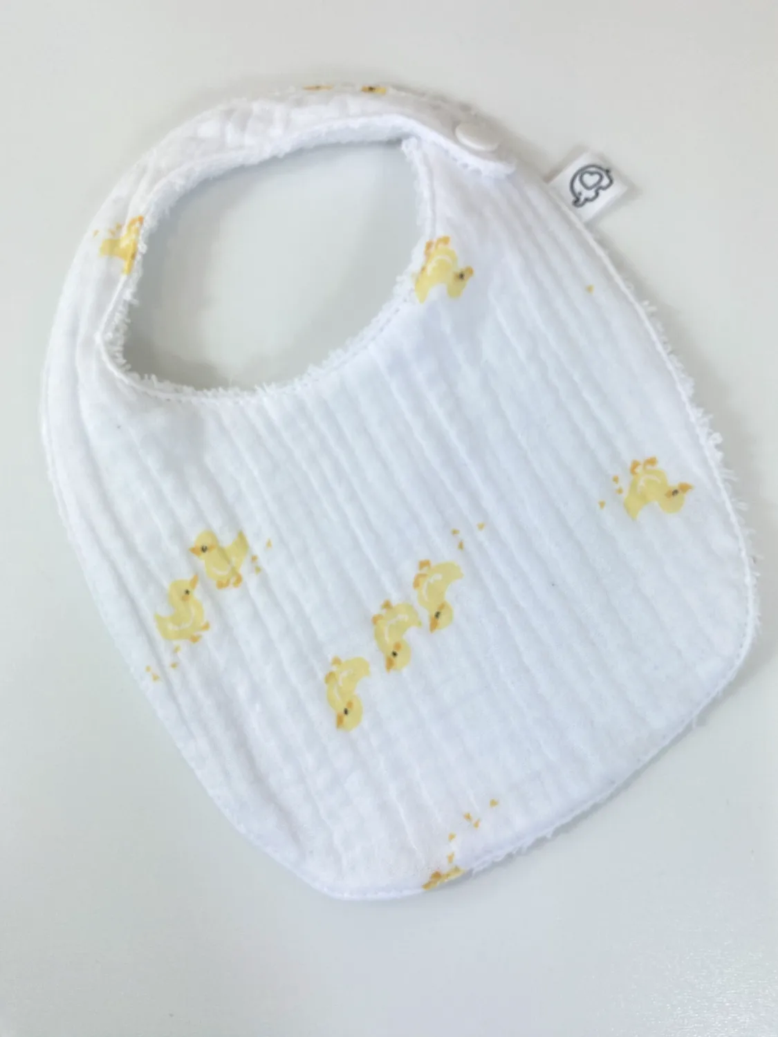 - Stiratura: Stirare dal lato del cotone a media temperatura. Attenzione: Se il bavaglino ha il nome ricamato, stirare al rovescio o interporre un panno per proteggere la lucentezza del filo.