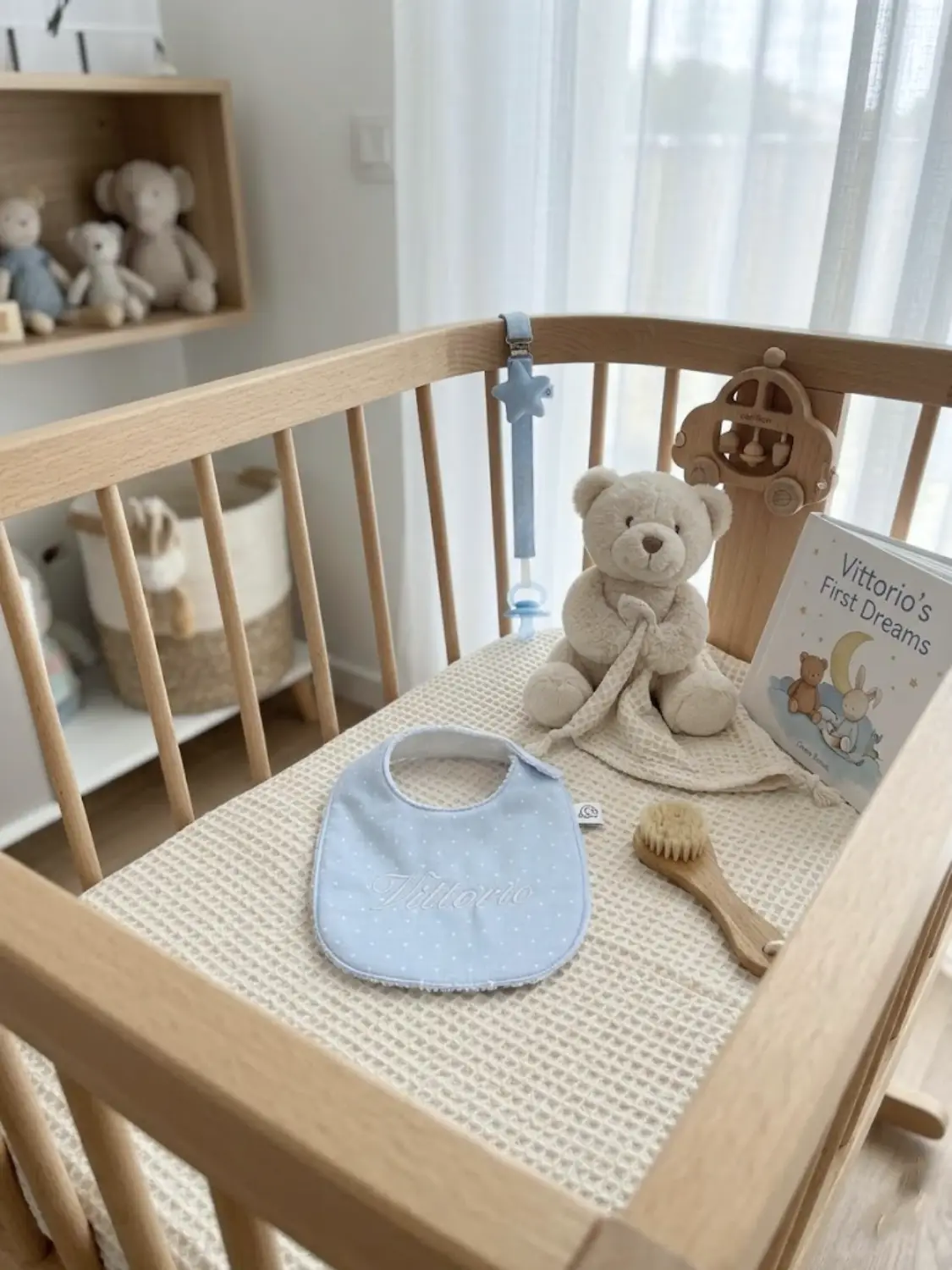 • Design Esclusivo: Disponibile in vari colori (azzurro, rosa, verde, bianco) con font eleganti per il nome del tuo bambino.
