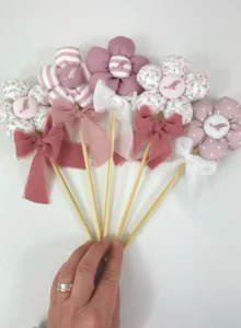 - Design a Bacchetta: montata su un pratico bastoncino in legno, rifinito con nastri in chiffon sfrangiato o cotone.