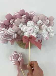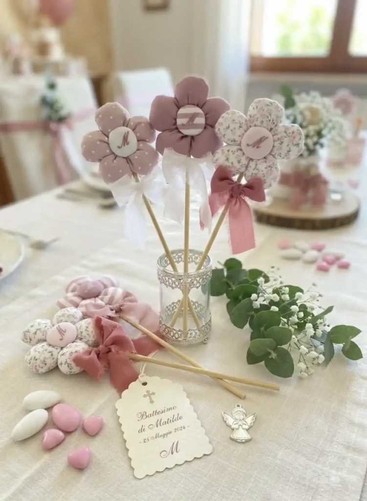 Una romantica Bomboniera Margherita in tessuto, realizzata interamente a mano. Un’idea originale e curata in ogni dettaglio, perfetta per celebrare Prime Comunioni, Cresime, Battesimi o feste a tema. Grazie al suo stelo in legno, può essere utilizzata come decorazione per vasi, centrotavola o come una delicata “bacchetta magica” ricordo.