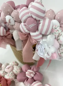 Ogni margherita è un pezzo unico, realizzato con cura artigianale. I soffici petali bombati sono creati abbinando diverse fantasie di puro cotone (delicate righe, pois e motivi floreali) nelle sfumature del rosa antico, malva e bianco.