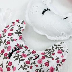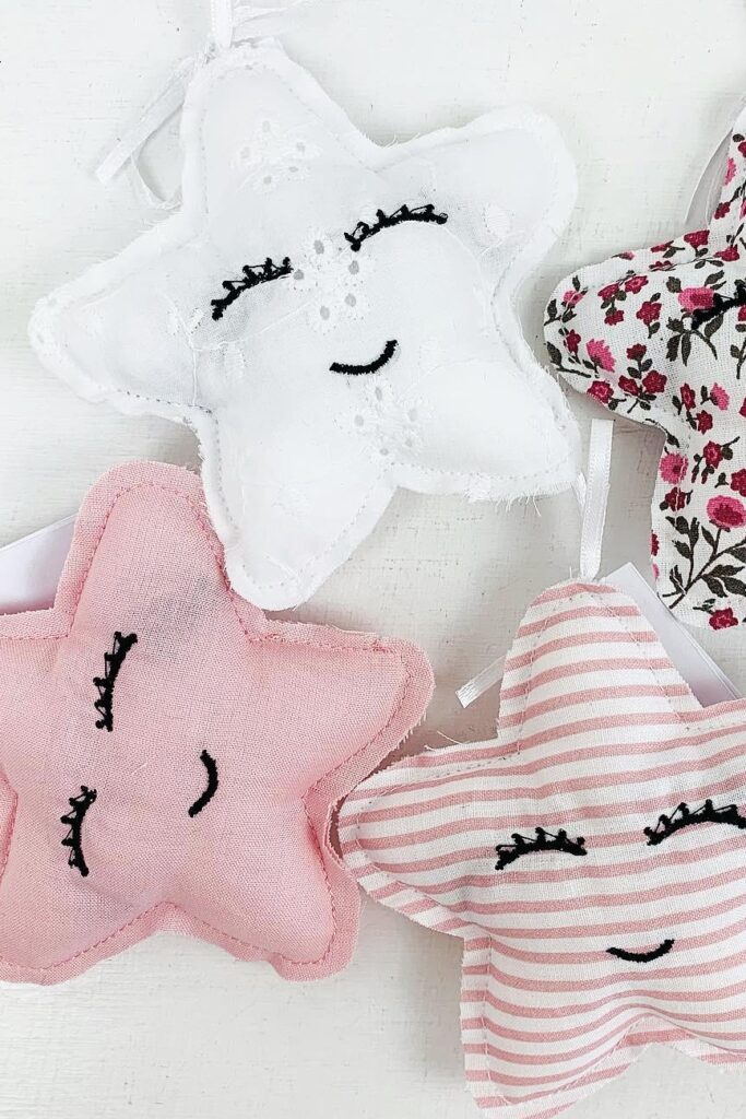 BOMBONIERA COMPLETA: Stella/luna/nuvola in cotone fantasie miste – visino ricamato- fiocchetto  in tulle – nastrino in raso e biglietto personalizzato.