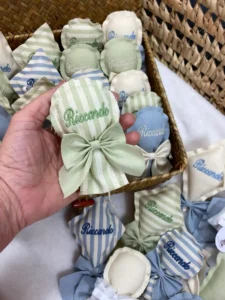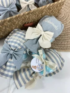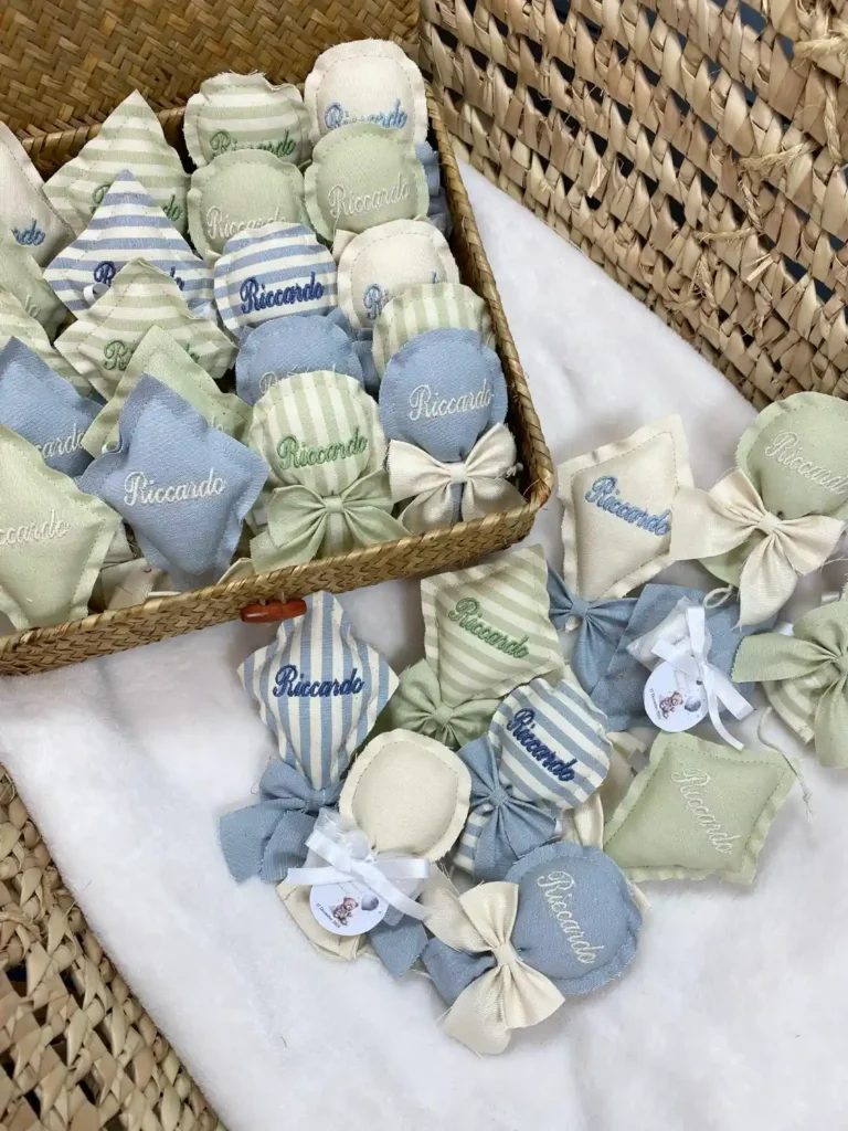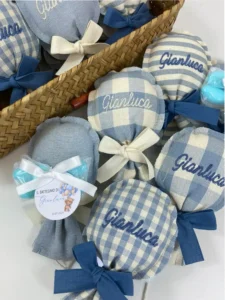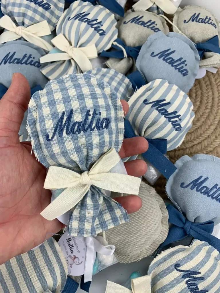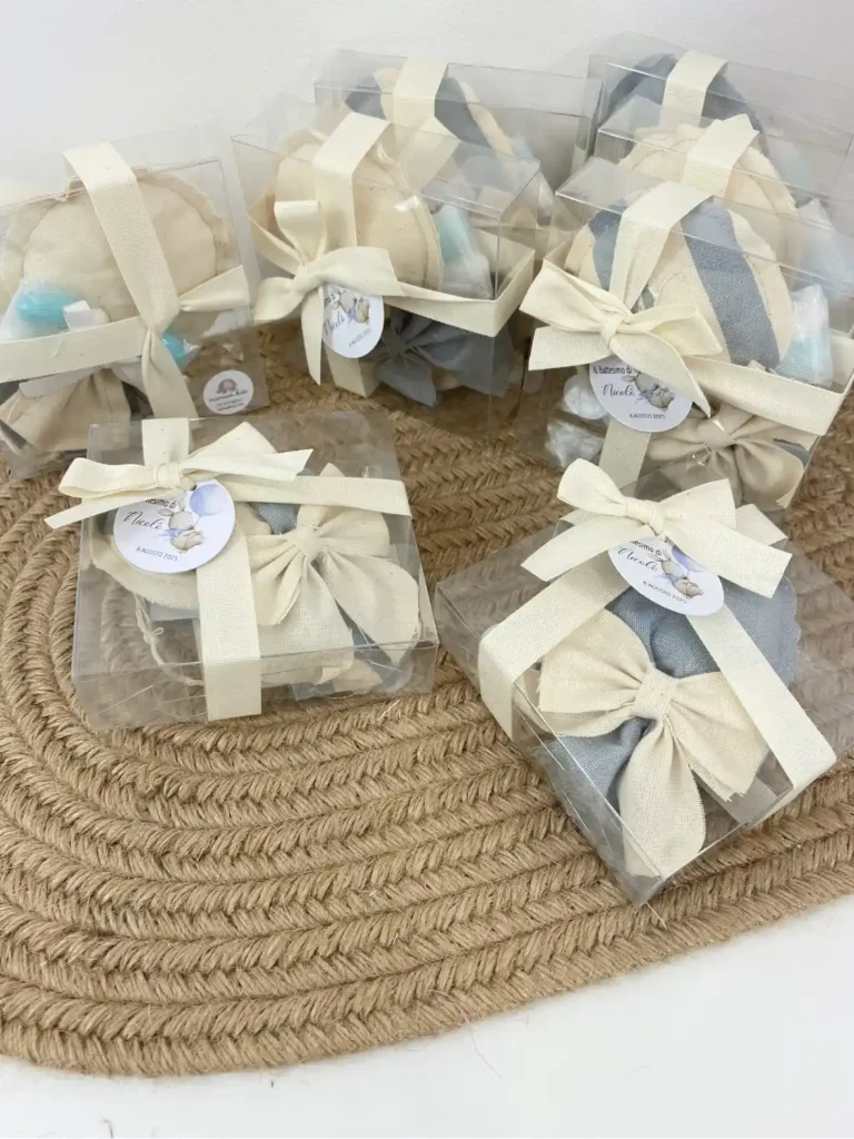 Tempi di Produzione: Per la creazione delle bomboniere, il confezionamento e l’eventuale ricamo, calcola sempre circa 15/20 giorni lavorativi dalla conferma dell’ordine.