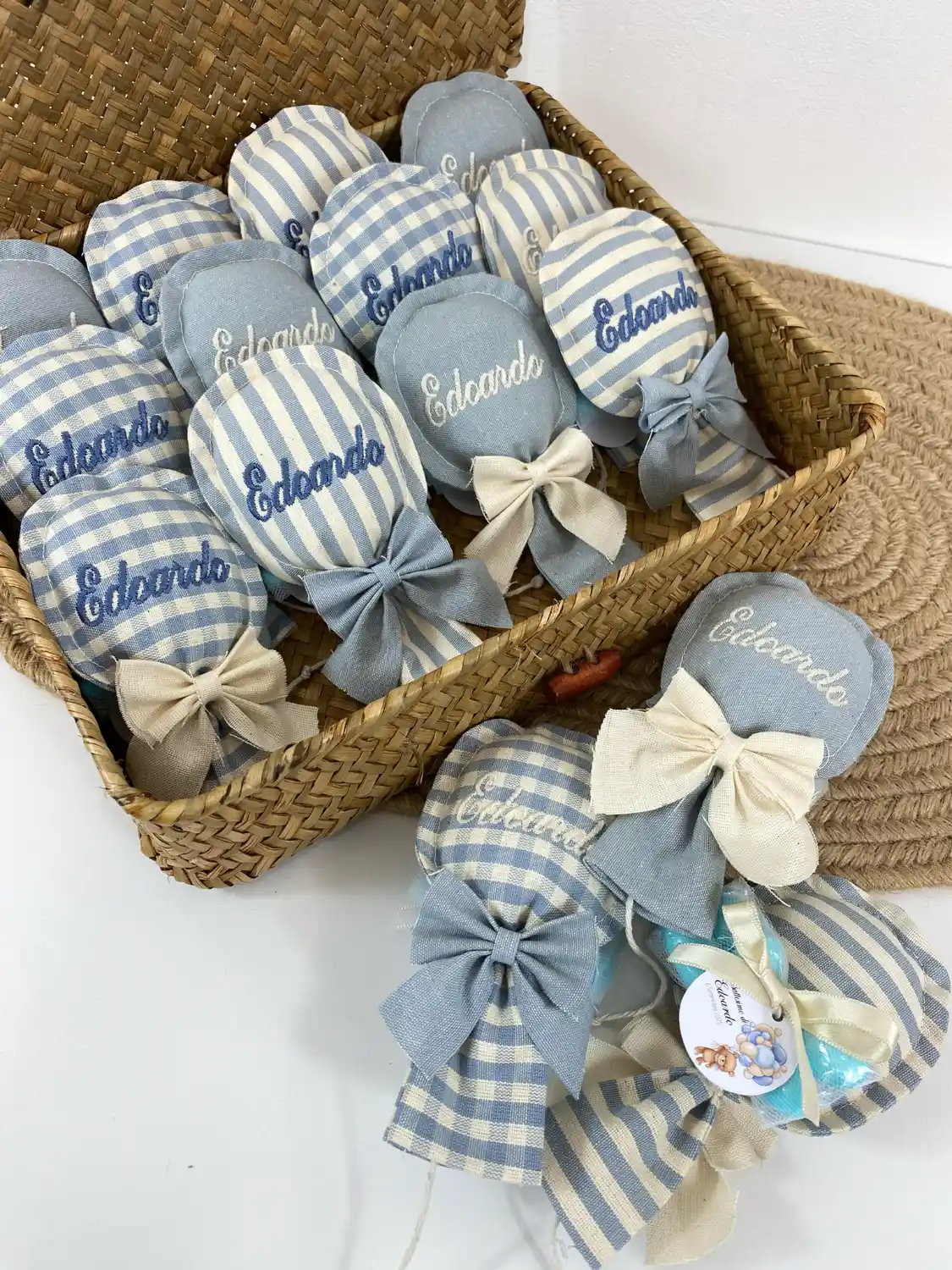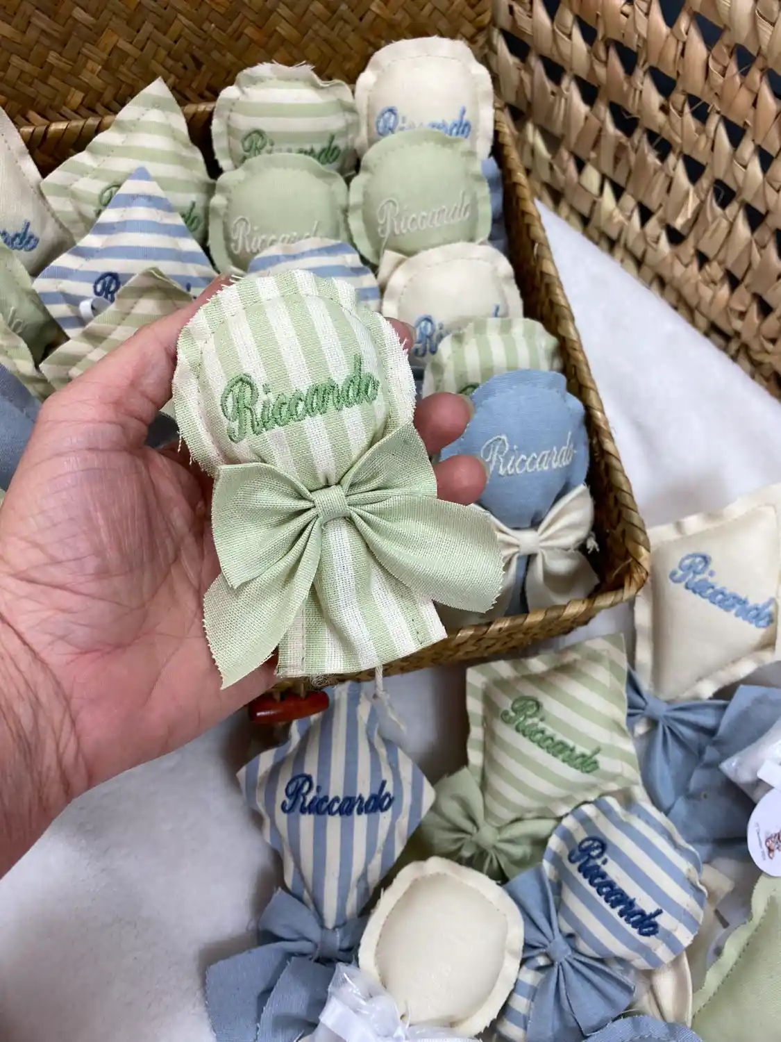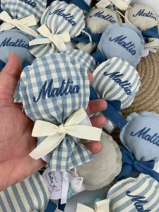 Carattere del Ricamo: Rendi inconfondibile la bomboniera scegliendo il font (un corsivo elegante, uno stampatello moderno, ecc.) con cui ricameremo a mano il nome del tuo bimbo.