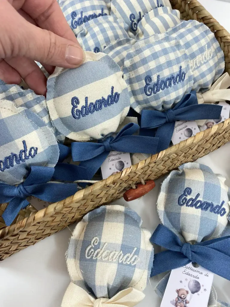 Bomboniere Palloncino Bimbo Ricamate cercando un ricordo unico ed elegante per il Battesimo o la Prima Comunione del tuo piccolo? Le nostre bomboniere palloncino bimbo ricamate rappresentano un’alternativa artigianale e raffinata ai classici oggettini. Ogni palloncino è un piccolo capolavoro di sartoria, pensato per celebrare i momenti più speciali con uno stile inconfondibile e totalmente personalizzato.