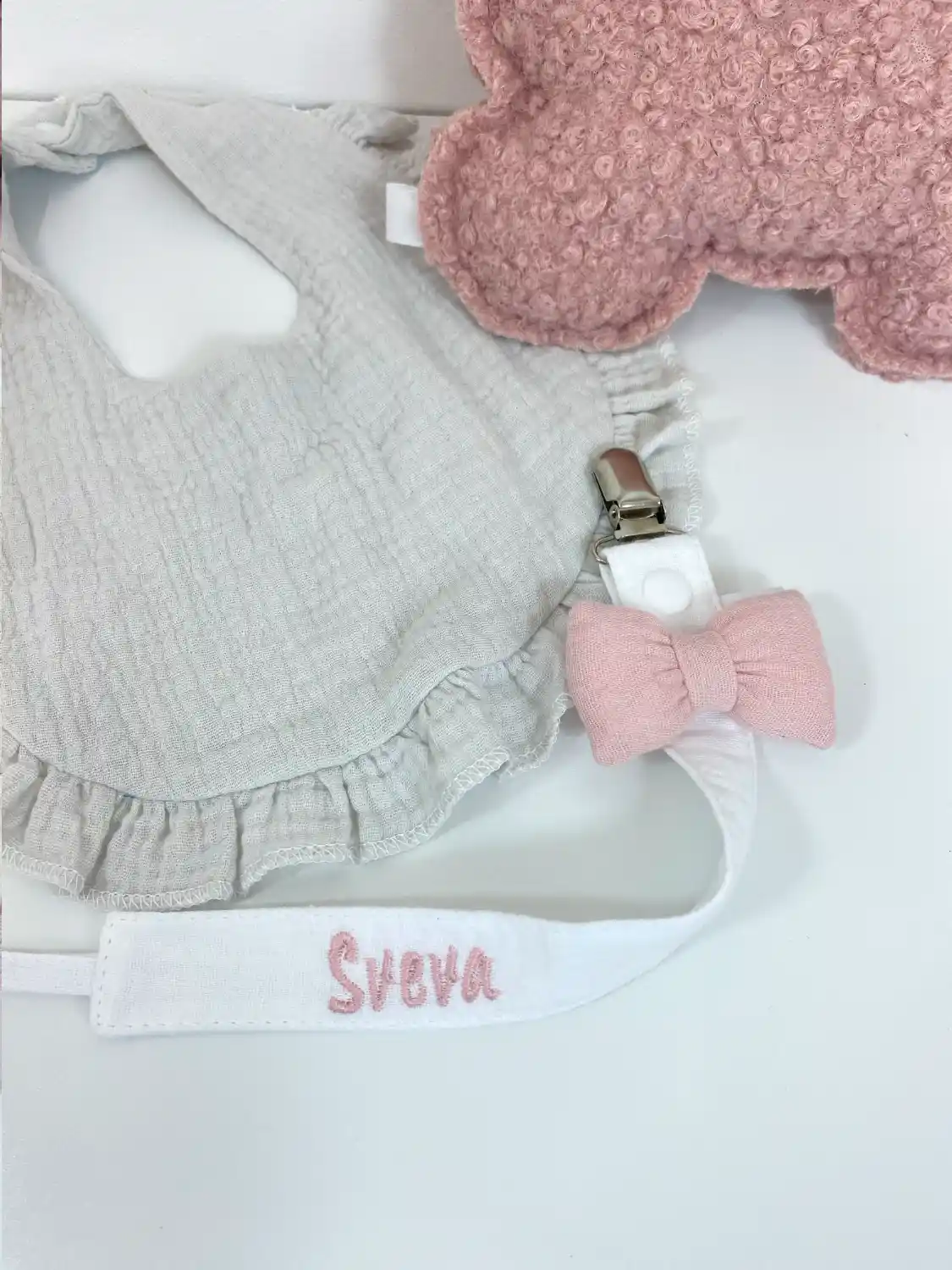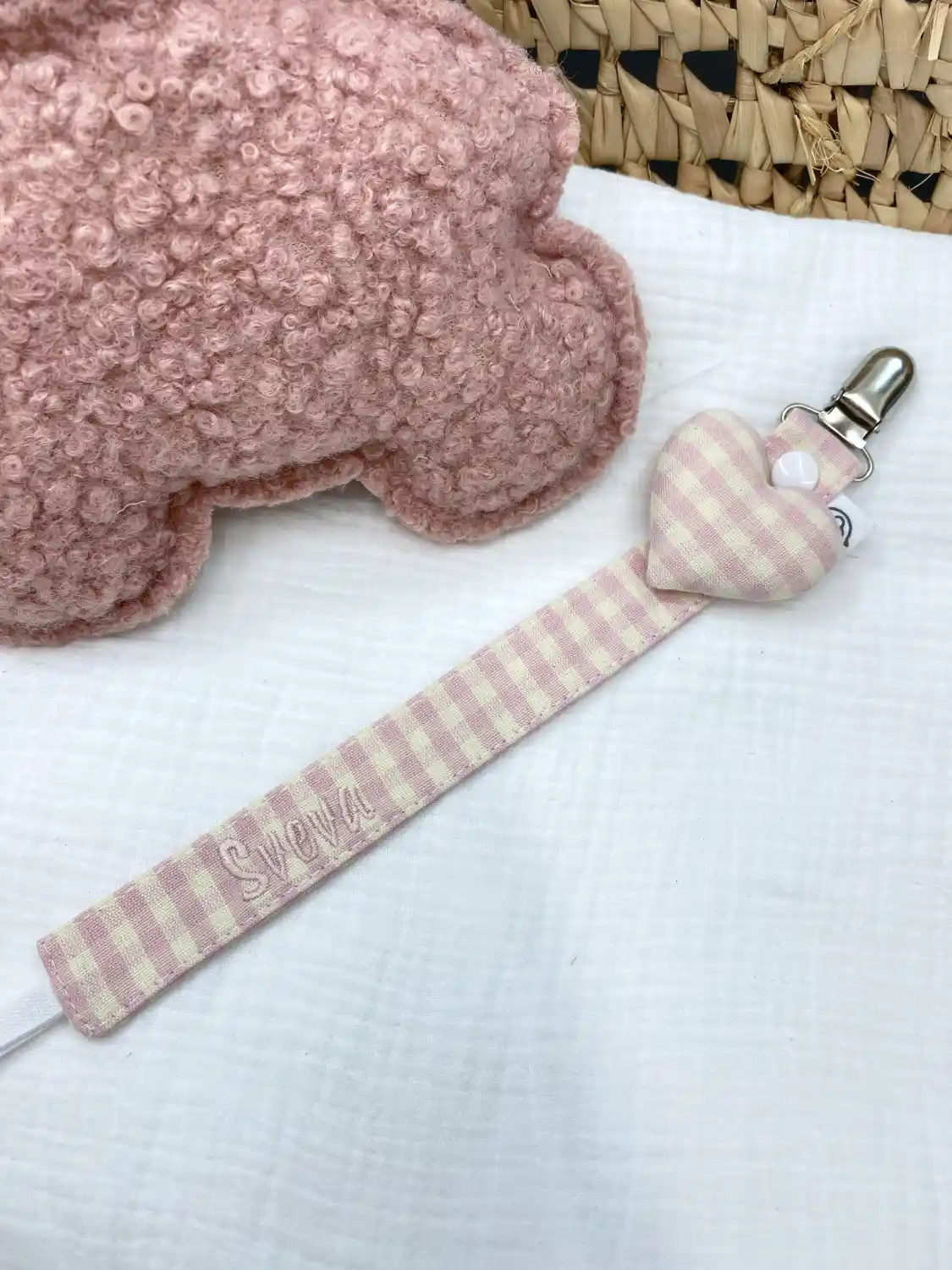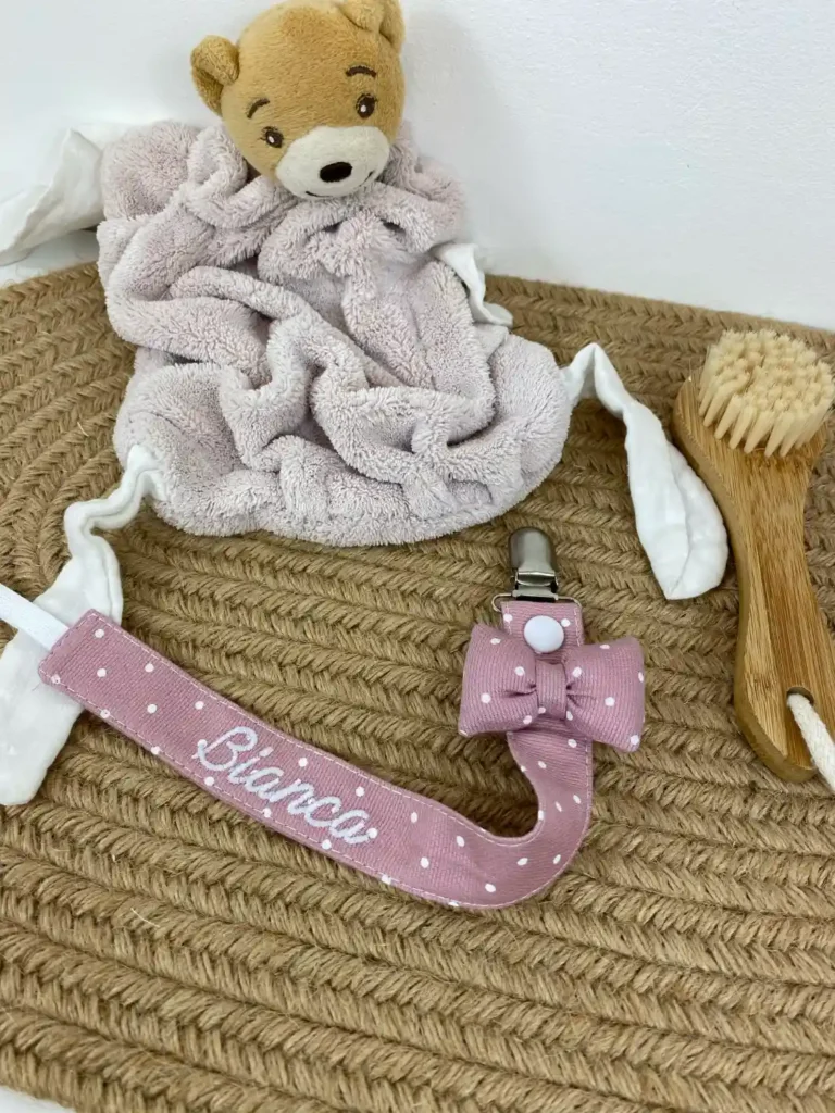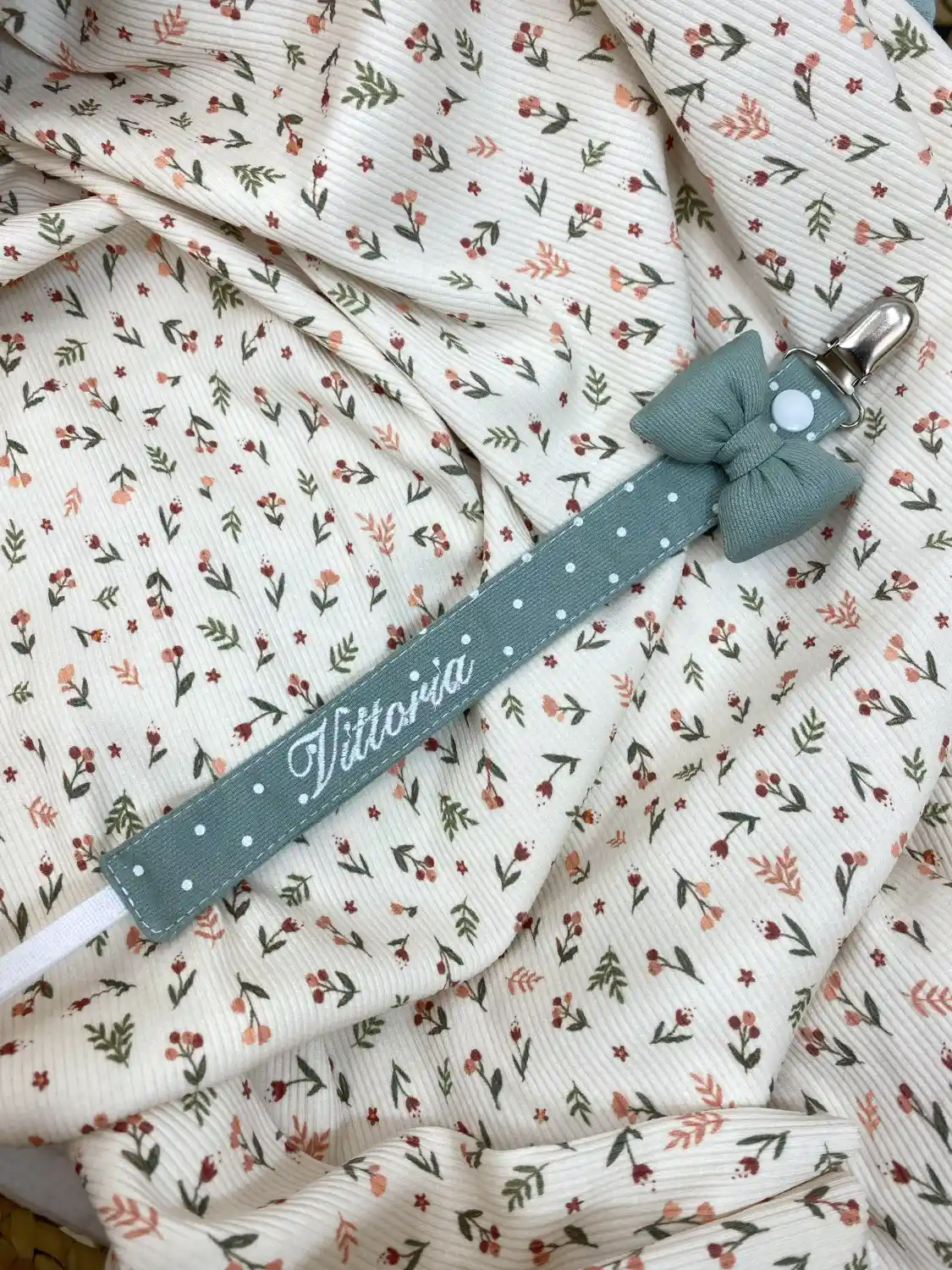 Rendi unico ogni momento della tua bambina con la nostra elegante catenella portaciuccio bimba personalizzata. Realizzata a mano in puro cotone sicuro e traspirante, è l’accessorio perfetto per non perdere mai il ciuccio e aggiungere un tocco di dolcezza ai suoi outfit.