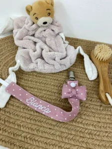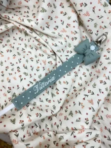 Cosa regalare per l’arrivo di una bambina? Vedere il nome della propria figlia (che sia Sofia, Flavia, Sveva, Camilla o Soraya) ricamato con cura su un accessorio come la catenella portaciuccio bimba a mano, è un’emozione unica per ogni neomamma.