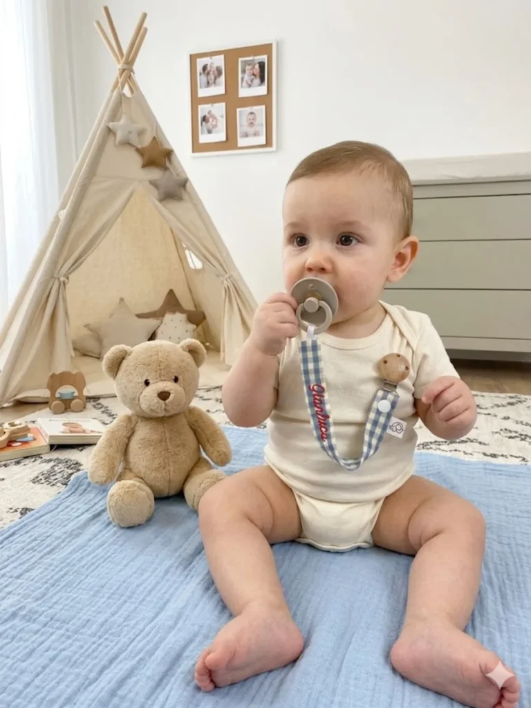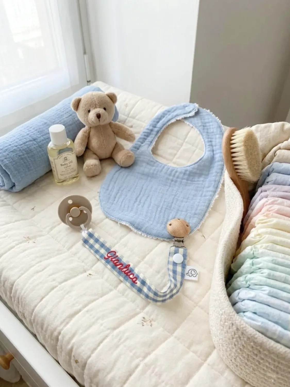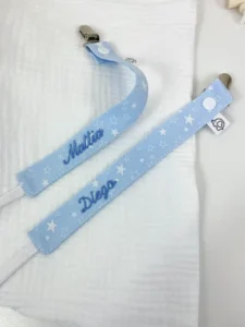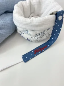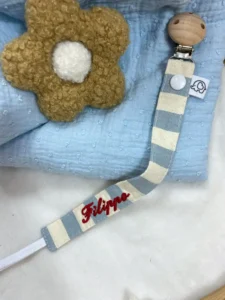 Queste catenelle portaciuccio sono realizzate interamente a mano con tessuti certificati e sicuri. Grazie alla personalizzazione con il nome ricamato, diventano un accessorio inconfondibile e un’idea regalo per neonati tra le più amate.