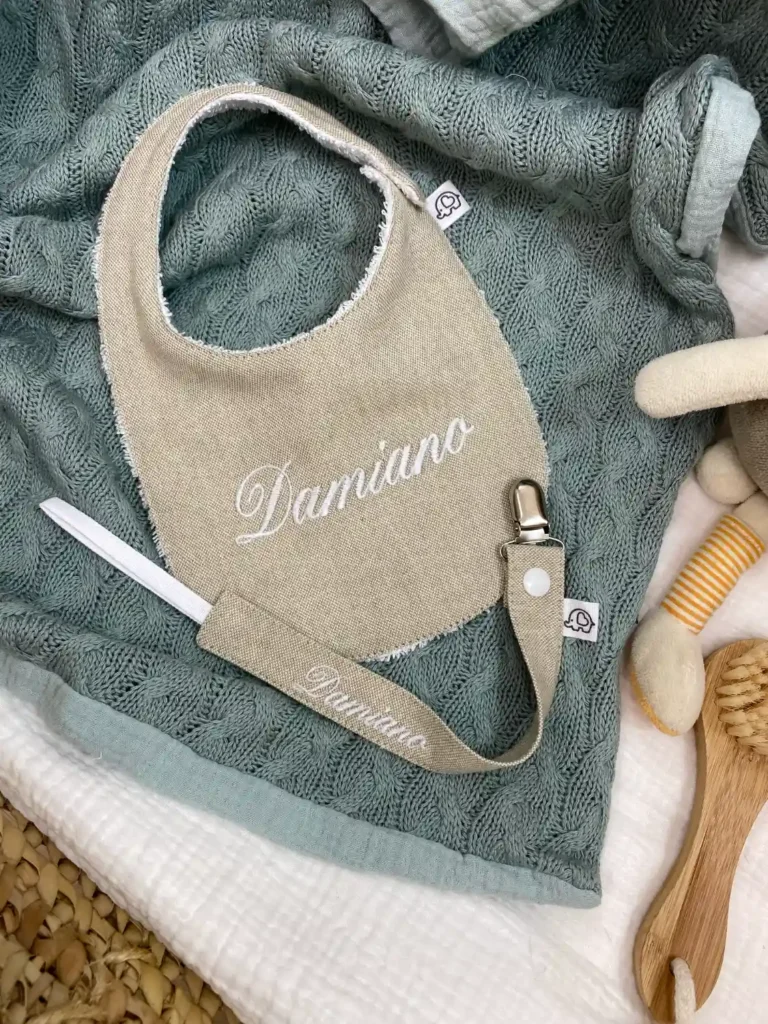 Ogni pezzo è realizzato artigianalmente prestando la massima attenzione ai dettagli. Il nome del tuo bambino o della tua bambina viene finemente ricamato sul nastro, trasformando un semplice oggetto quotidiano in un ricordo speciale da conservare per sempre.