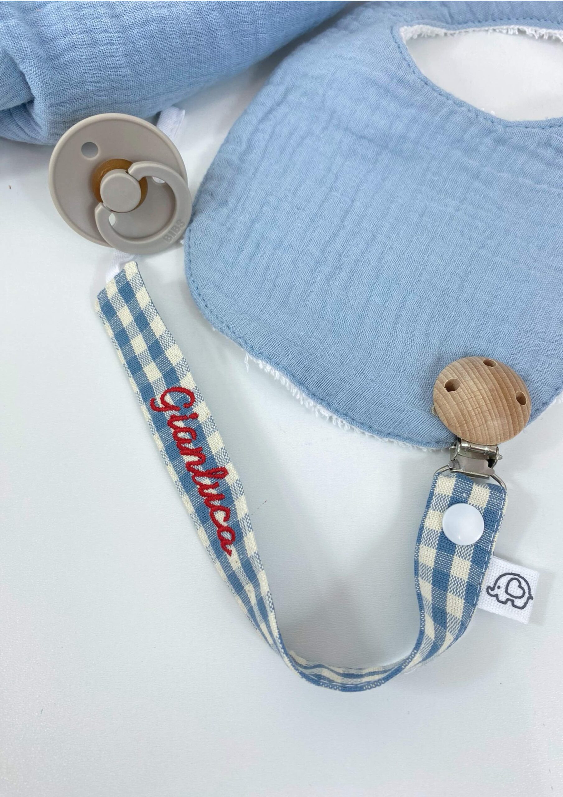Ogni catenella portaciuccio è realizzata a mano e personalizzabile su richiesta tra varie fantasie tessuto e ricamo nome.