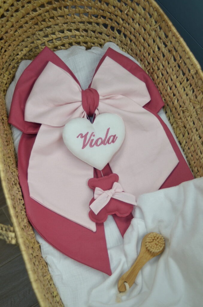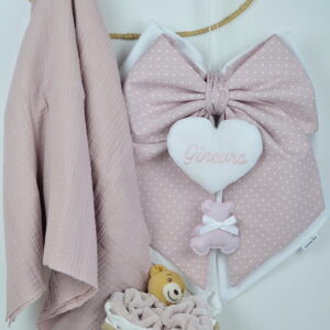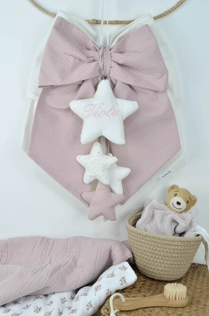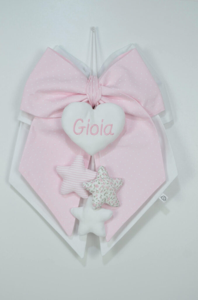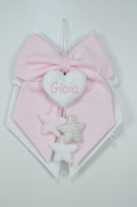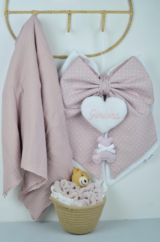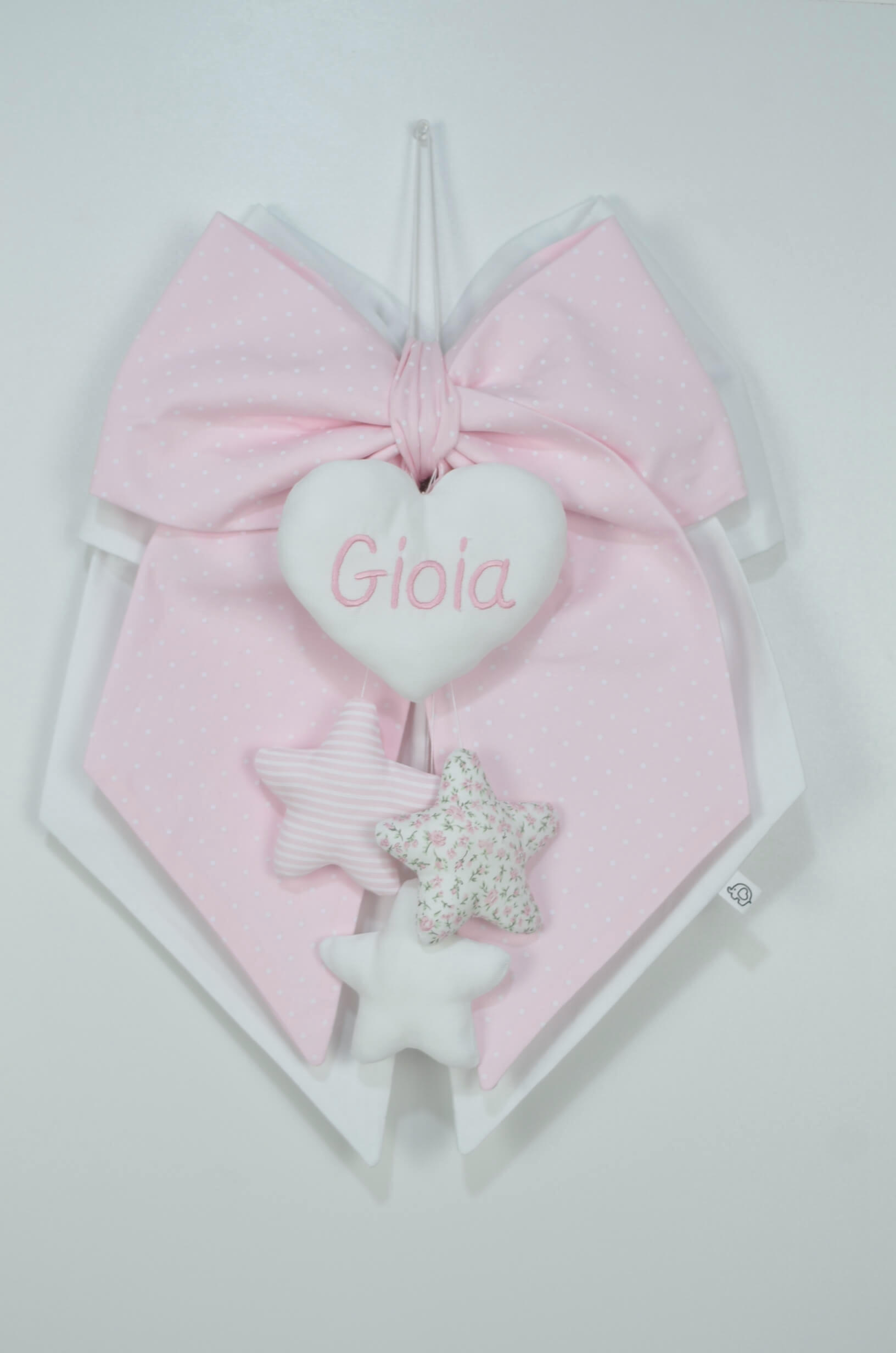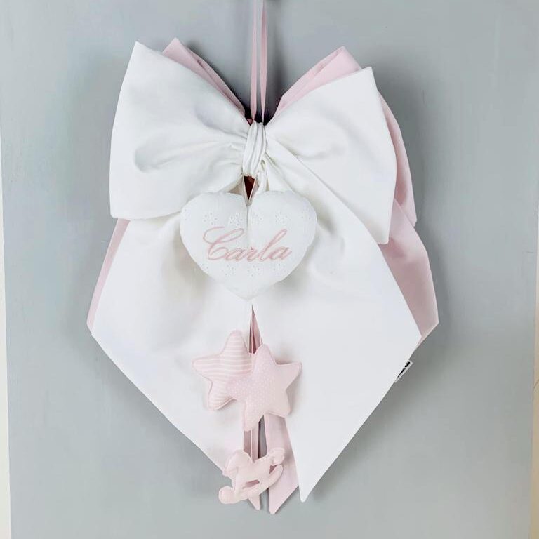 PERSONALIZZA: Scegliendo questa opzione, puoi scegliere passo passo tessuto fiocco, numero e tipologia pendenti, inserire ricamo nome .