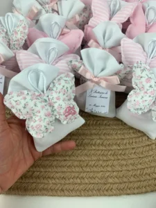 Tempi di Produzione: Per la creazione delle bomboniere, il confezionamento e l’eventuale ricamo, calcola sempre circa 15/20 giorni lavorativi dalla conferma dell’ordine.