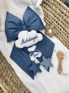 PERSONALIZZA: Scegliendo questa opzione, puoi scegliere passo passo tessuto fiocco, numero e tipologia pendenti, inserire ricamo nome .