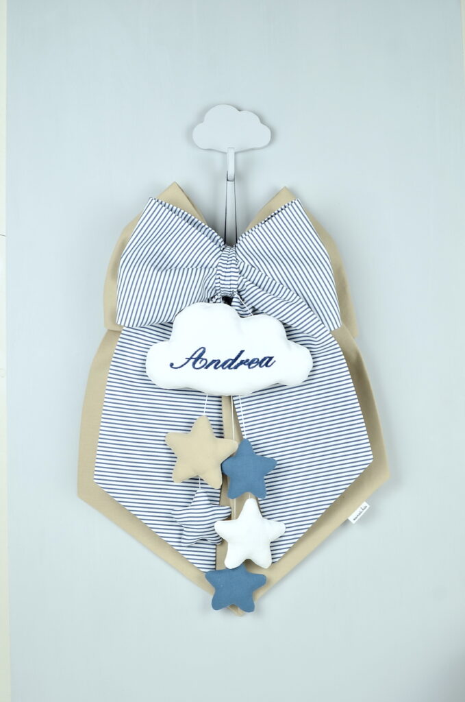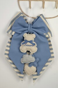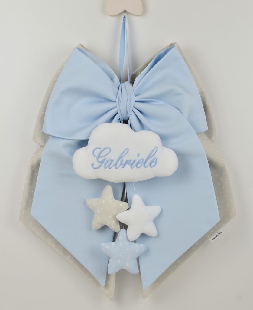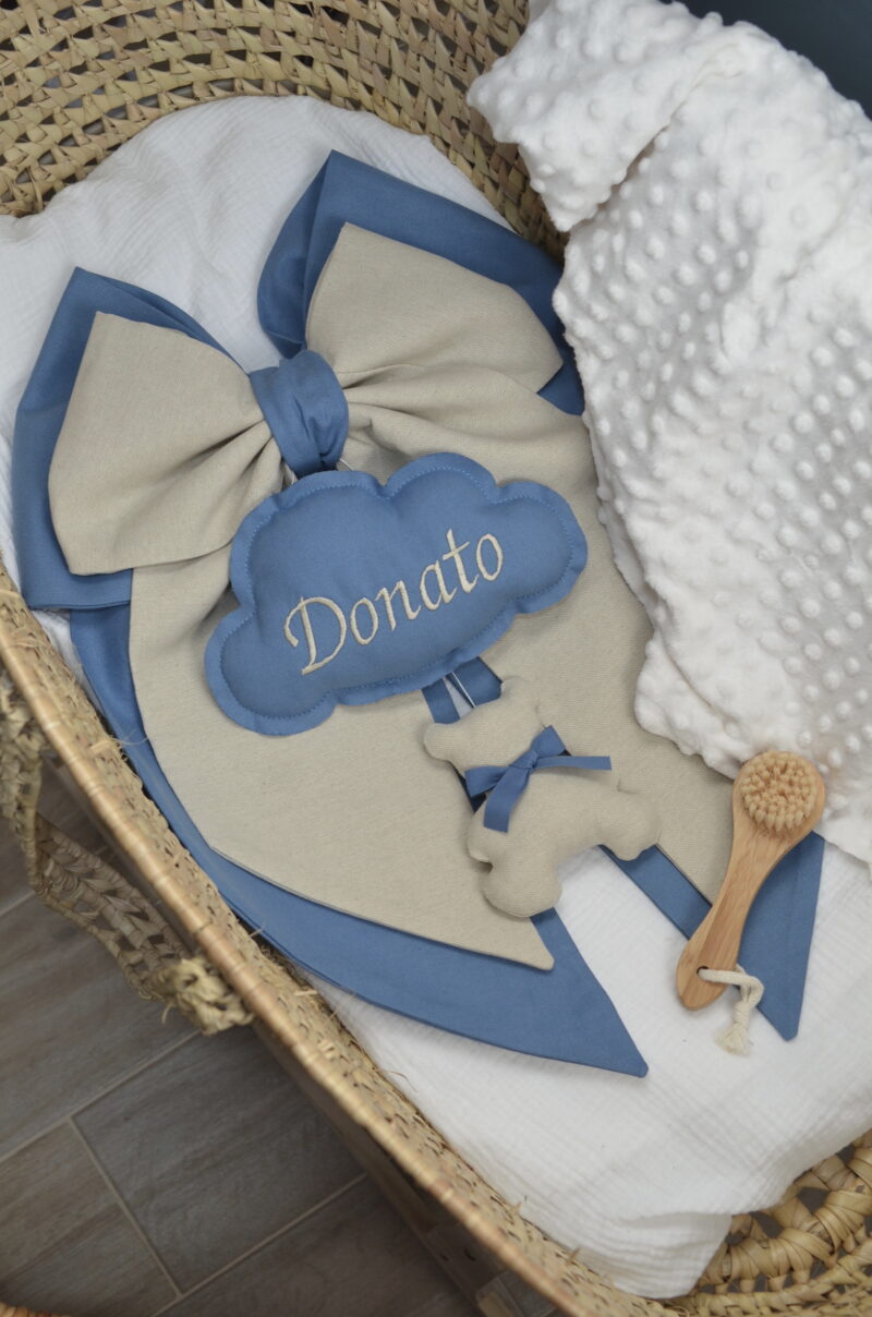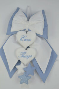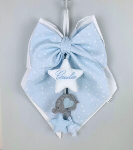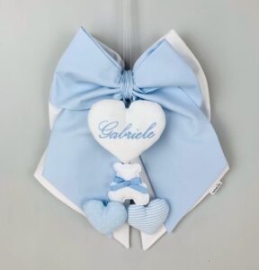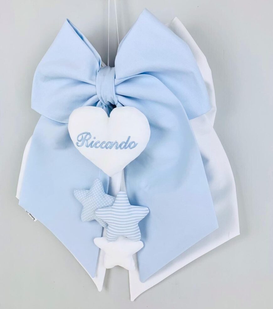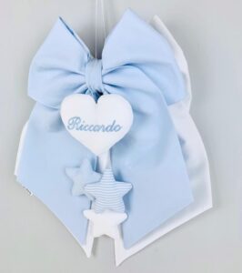 PERSONALIZZA: Scegliendo questa opzione, puoi scegliere passo passo tessuto fiocco, numero e tipologia pendenti, inserire ricamo nome .