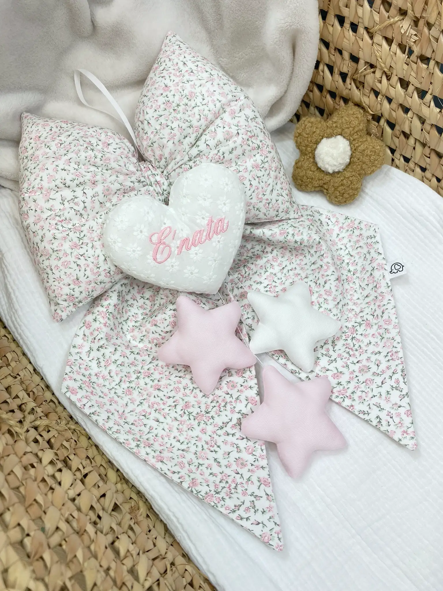 Ogni Fiocco nascita fiori rosa con Cuore Ricamato e Stelline Pendenti è un pezzo unico, realizzato artigianalmente con tessuti di alta qualità. La raffinata fantasia floreale in nuance pastello si sposa perfettamente con il bianco del piquet centrale, creando un contrasto armonioso e molto sofisticato.