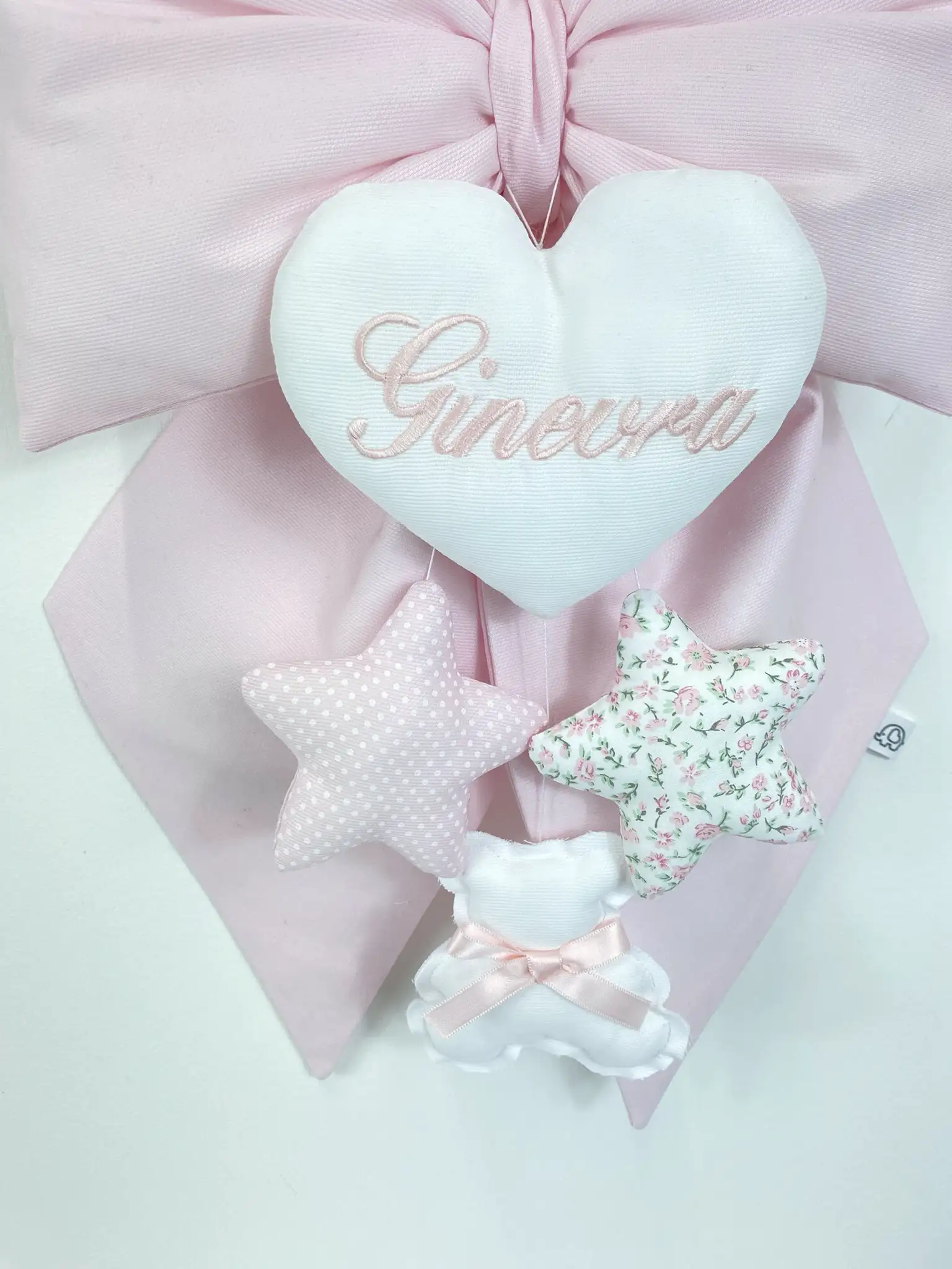Il fiocco nascita è un oggetto decorativo delicato. Se dovesse prendere polvere, basta tamponarlo leggermente con un panno morbido o utilizzare un rullo levapelucchi.