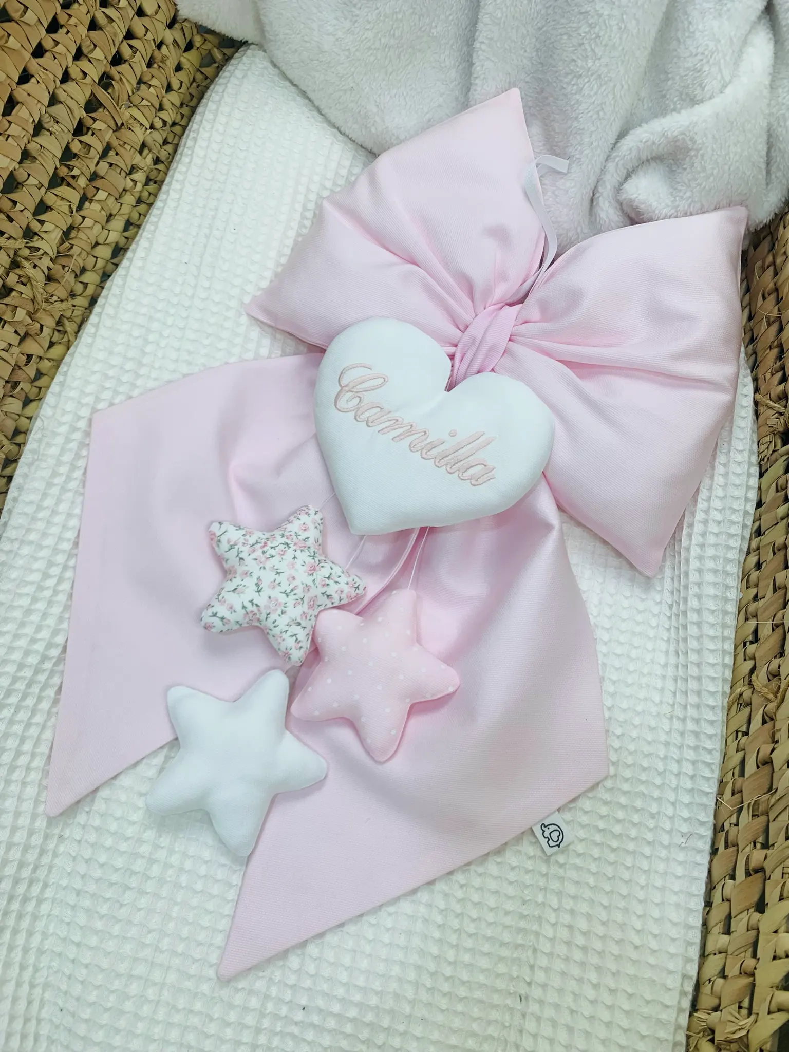 La scelta ideale per annunciare l’arrivo della tua bambina con eleganza e dolcezza. Realizzato in pregiato tessuto piquet rosa, questo fiocco è un pezzo unico interamente fatto a mano.