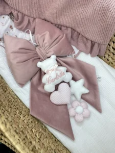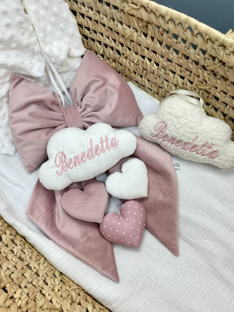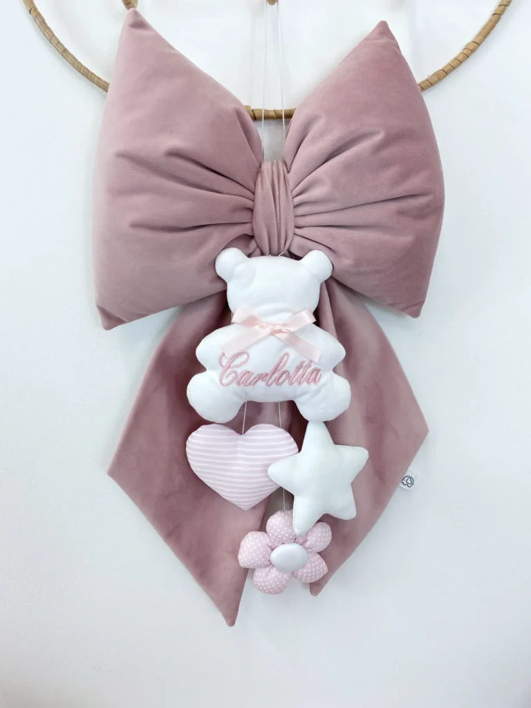 Esclusivo Fiocco in Velluto è più di una semplice decorazione: è un Dolce ricordo. Il pendente centrale può essere Personalizzato con il nome della tua piccola, trasformandolo in un pezzo Unico e Prezioso. Perfetto come coccarda nascita e decorazione per culla. Scegli la Morbidezza e l’eleganza per celebrare il tuo evento più Importante.