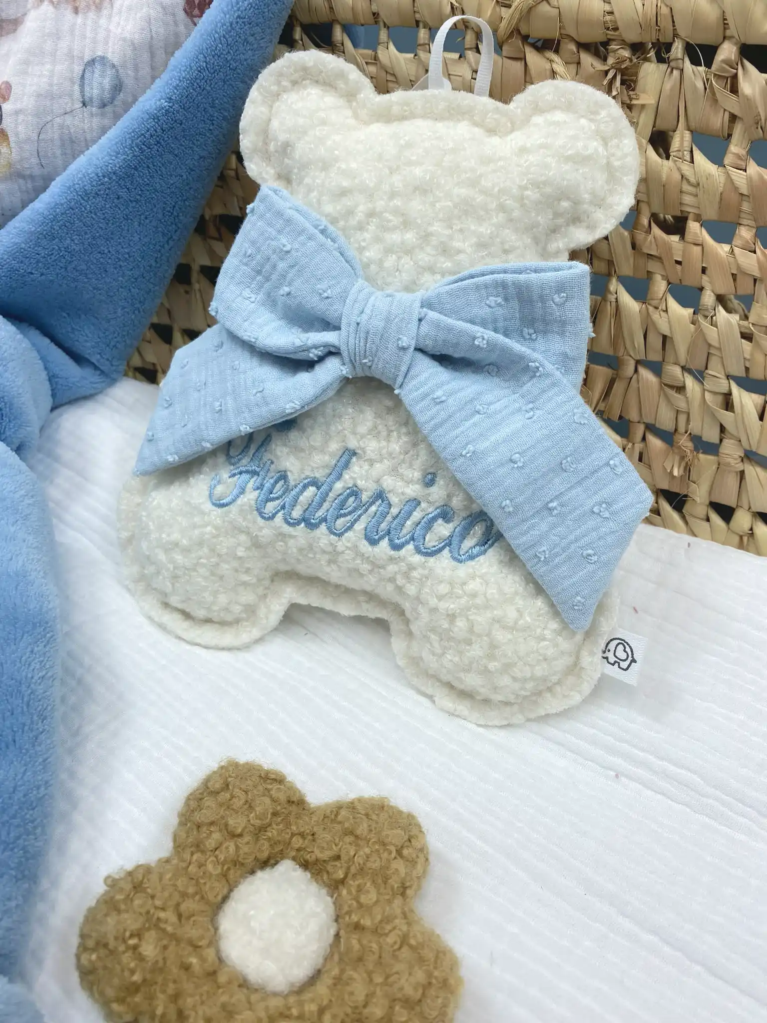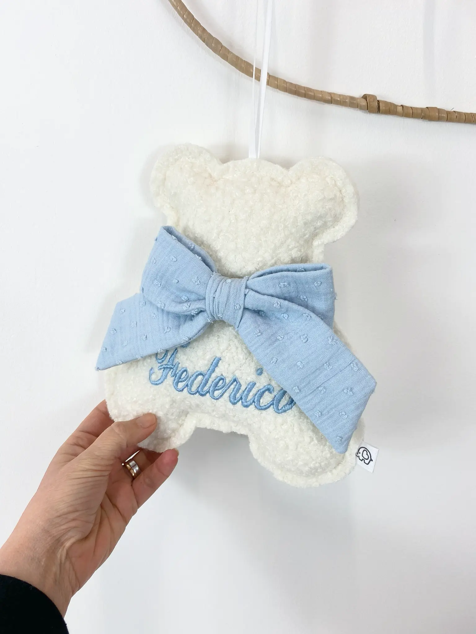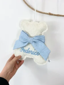 Aggiungi un tocco di tenerezza alla cameretta con il nostro Orsetto Bouclé culla neonato . Realizzato artigianalmente, ogni orsetto è impreziosito da un elegante fiocco in mussola, un campanellino e il nome ricamato.. Il regalo perfetto per una nascita o un battesimo.