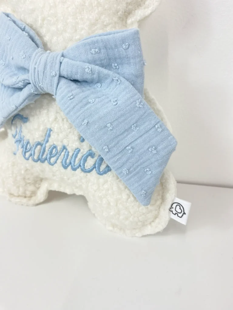 Personalizzazione: Il nome è ricamato con cura, rendendo ogni orsetto un pezzo unico e indimenticabile.