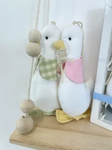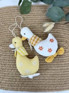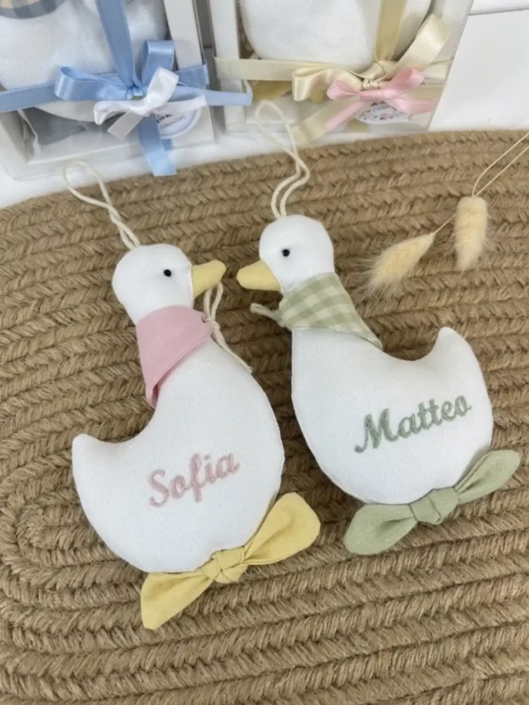 Nome o Iniziale Ricamata: Possiamo ricamare a mano il nome del tuo bimbo o della tua bimba direttamente sul colletto colorato o sul fianco della paperella. Un dettaglio prezioso che trasforma l’oggetto in un regalo dedicato.