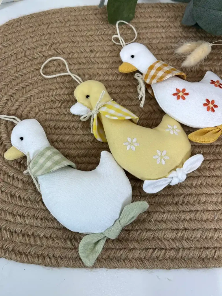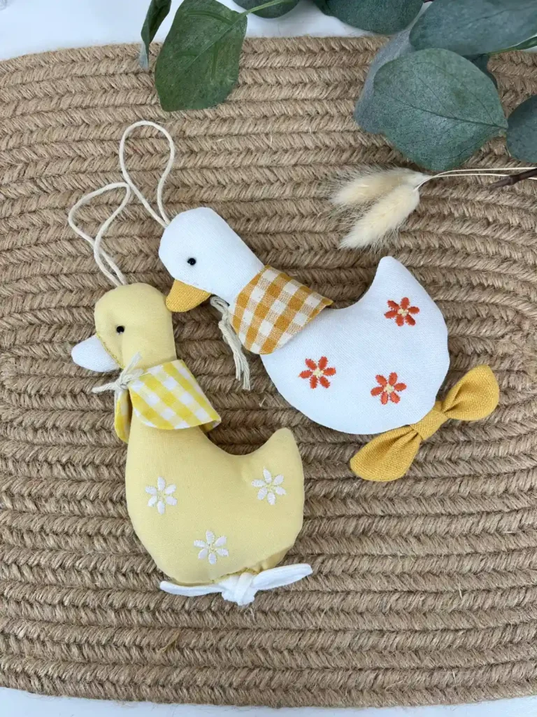 Ogni pezzo è realizzato interamente a mano, con una cura meticolosa per i dettagli: dal corpo in morbido cotone giallo pastello o bianco candido, fino alle graziose bandane in tessuto vichy o floreale che donano un carattere unico a ogni esemplare.