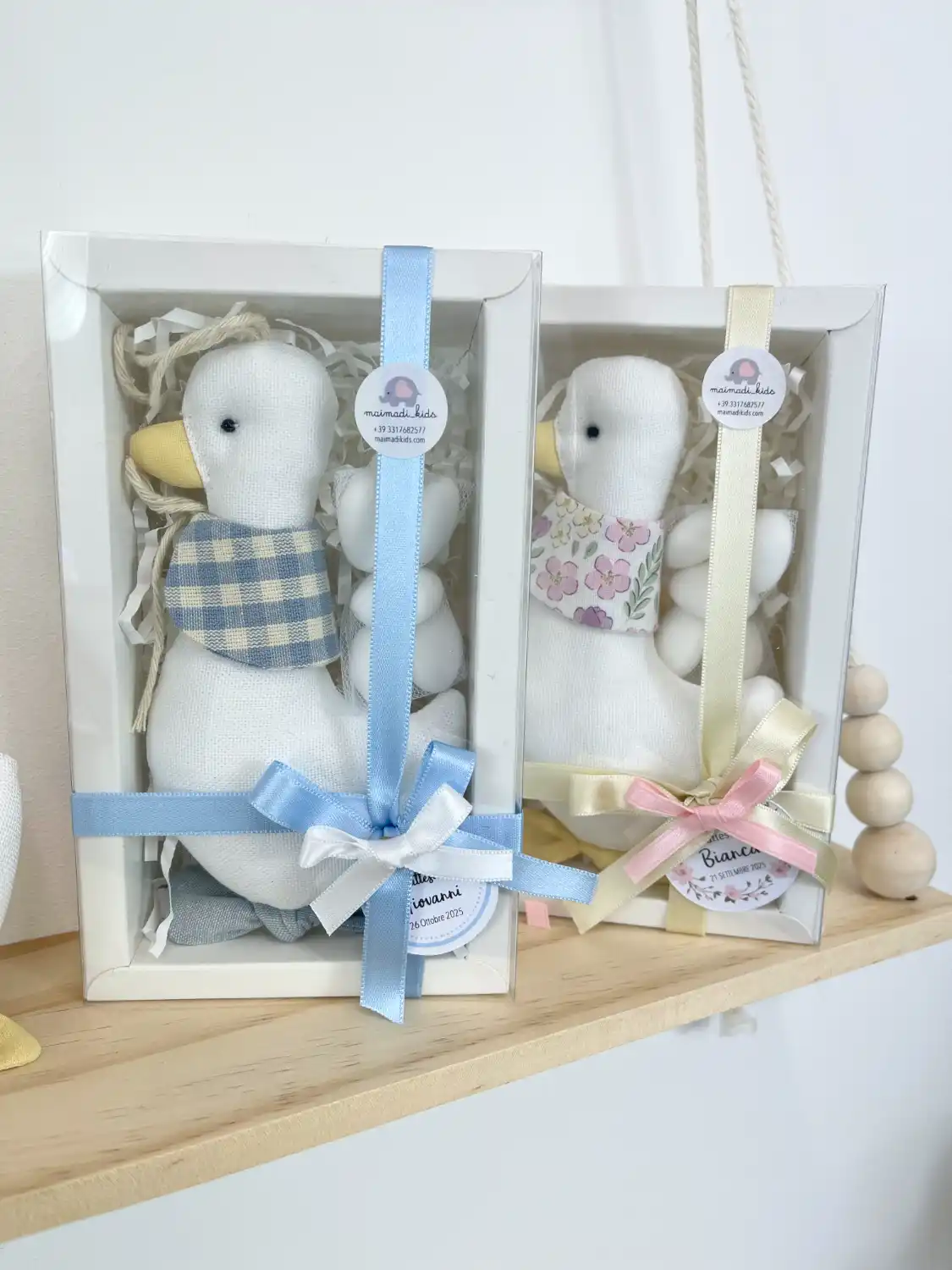 Versione con Scatolina : La scelta più prestigiosa. La paperella viene presentata in una scatola trasparente rifinita con nastri in raso coordinati (azzurro, rosa o panna), come mostrato nelle nostre foto gallery.