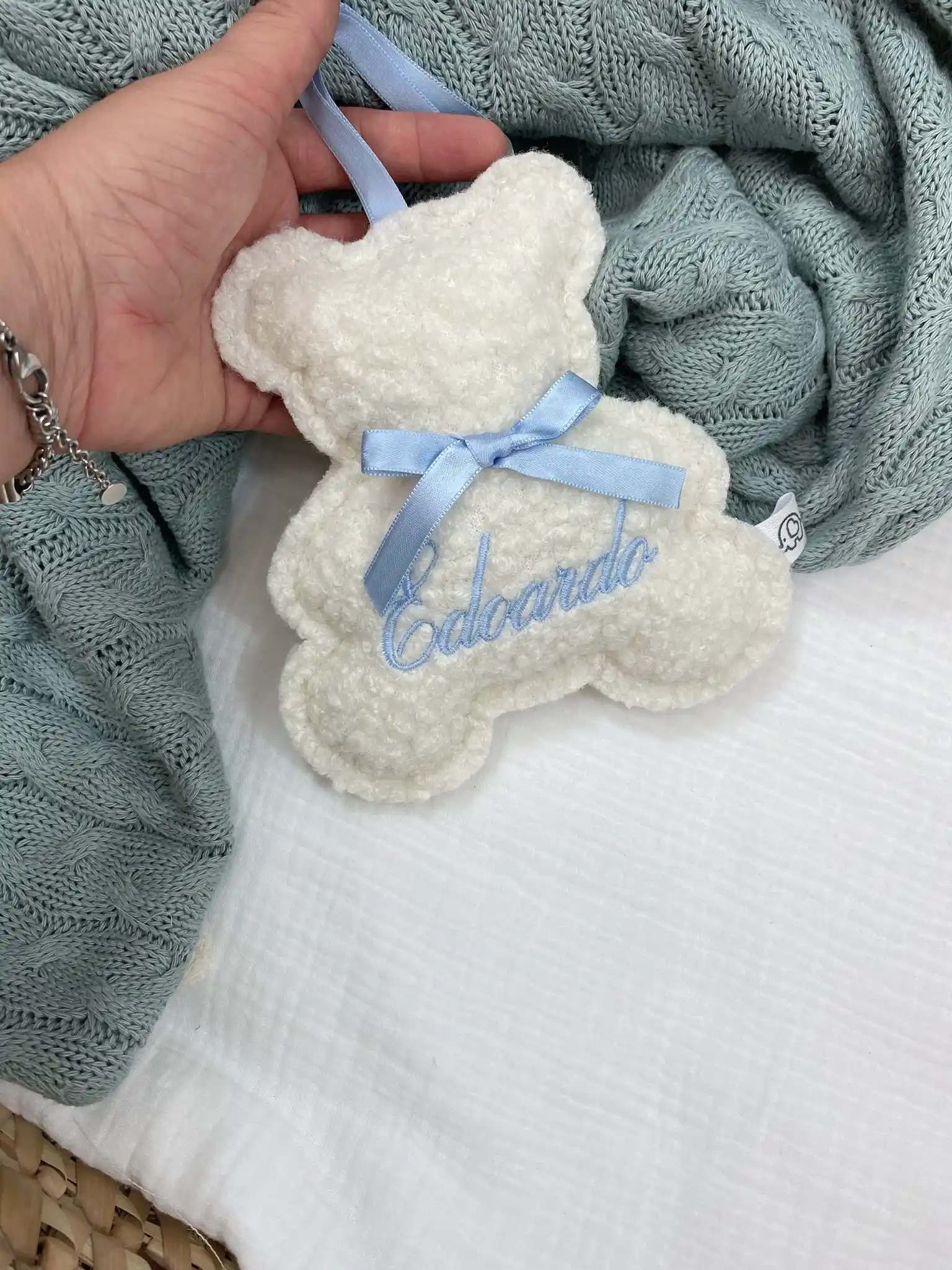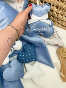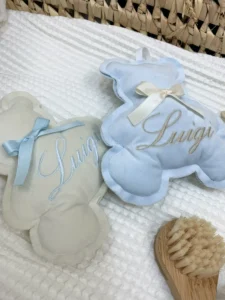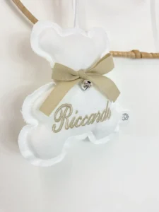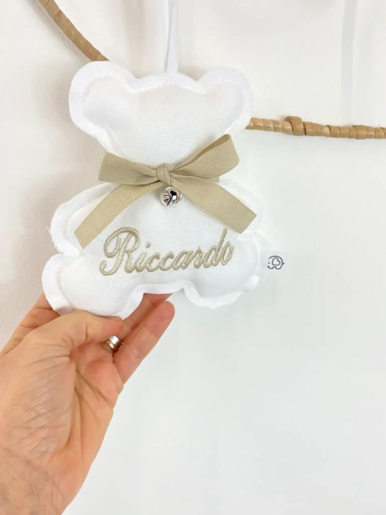 Realizzato interamente a mano con tessuti sicuri e di altissima qualità (dal morbidissimo tessuto effetto “peluche” ai classici e freschi cotoni), questo pendente è molto più di una semplice decorazione. Al centro dell’orsetto viene ricamato il nome del tuo bambino, impreziosito da un delizioso fiocchetto in raso coordinato. Oltre al classico orsetto, puoi scegliere di realizzare il pendente anche in altre dolci forme, come cuori o stelline!