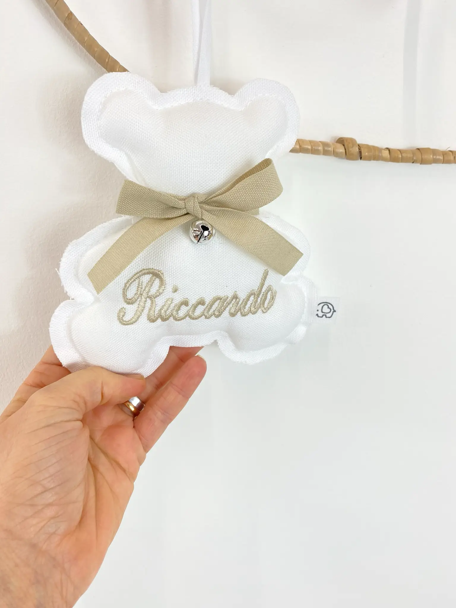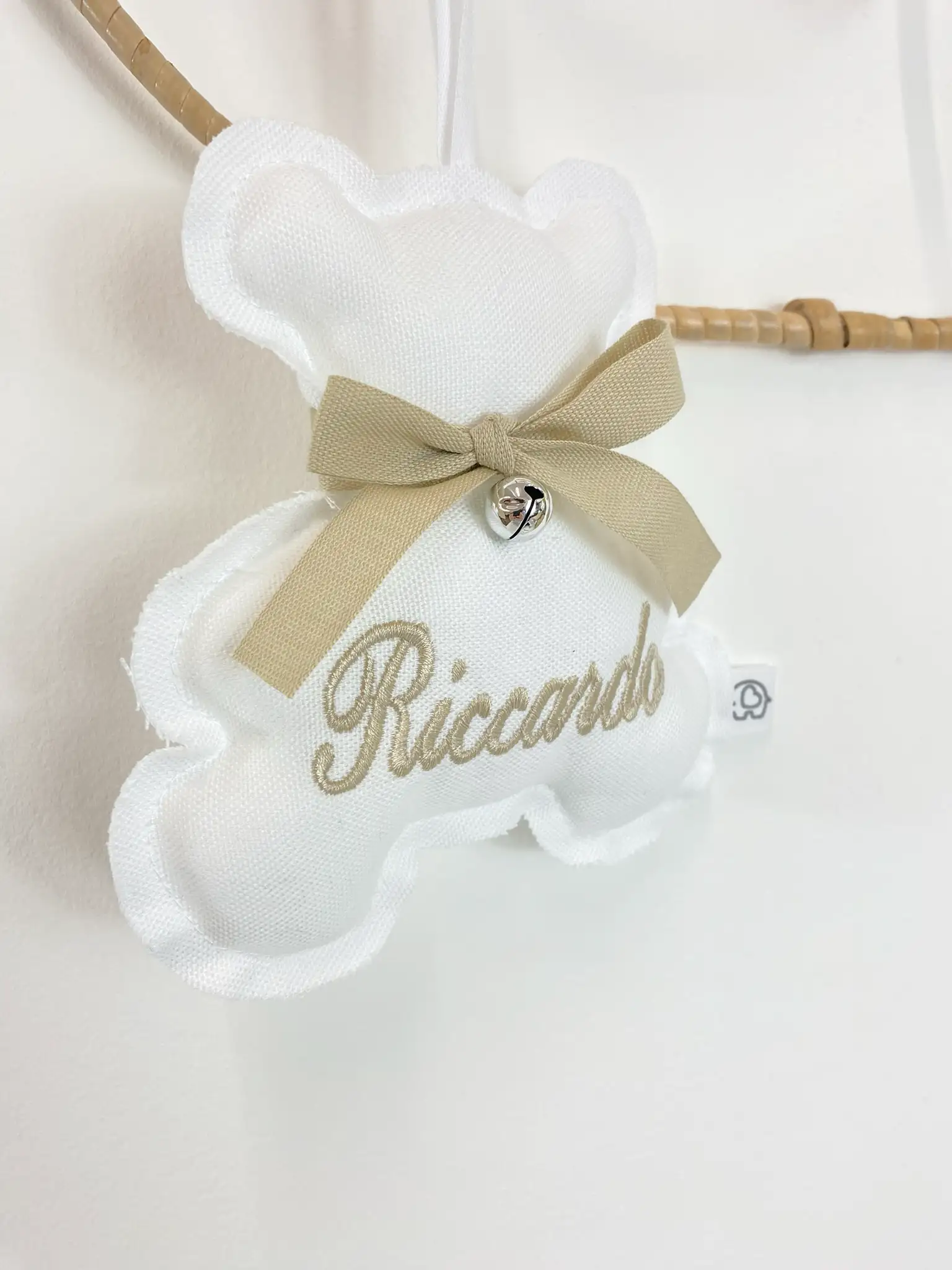 Aggiungi un tocco di tenerezza alla cameretta con il nostro Orsetto personalizzato con nome . Realizzato artigianalmente, ogni orsetto è impreziosito da un elegante fiocco , un campanellino e il nome ricamato.
