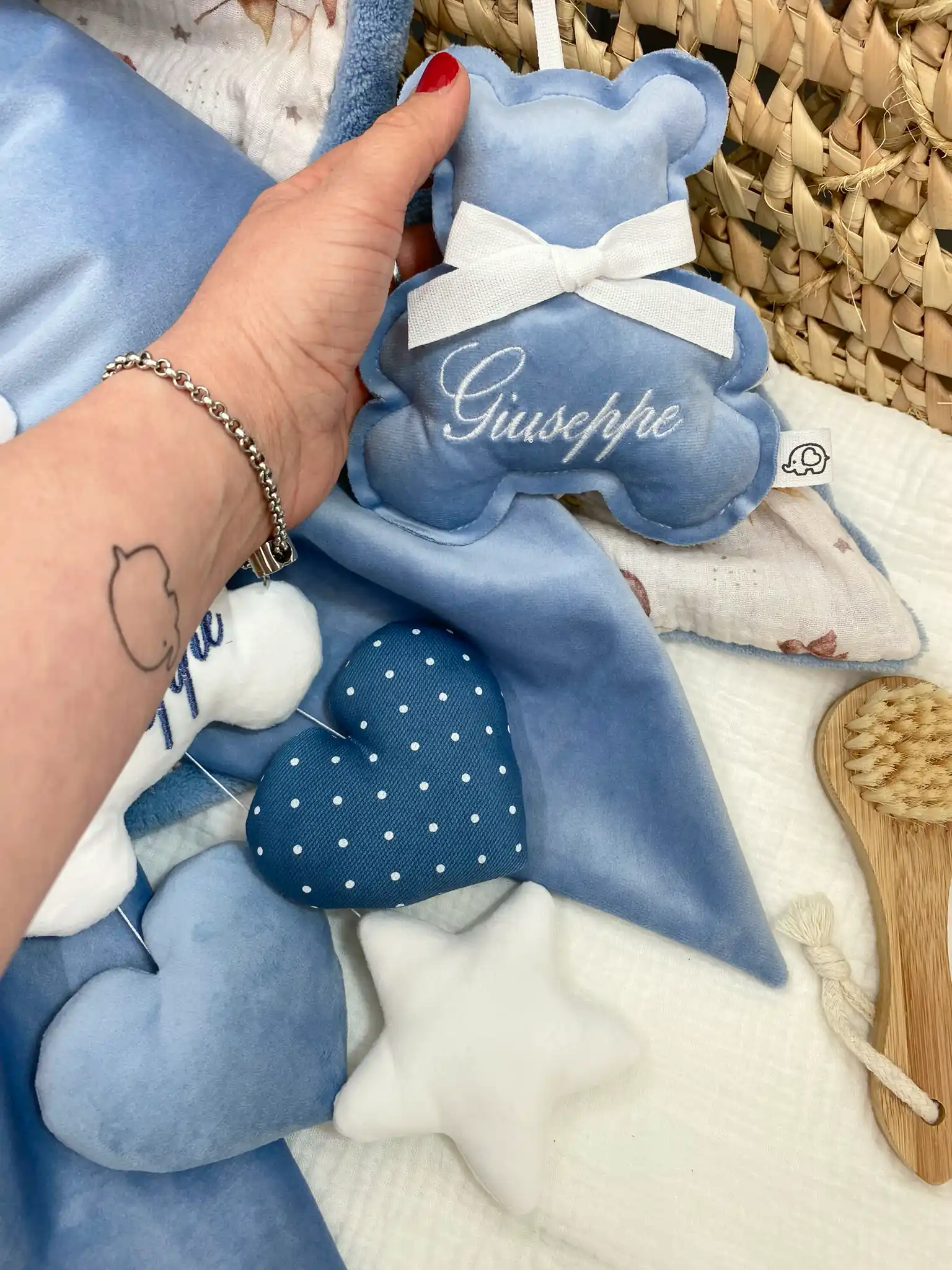 Puoi indicare il nome del bimbo o i dettagli desiderati nelle note dell'ordine al momento del Checkout. Trattandosi di prodotti fatti a mano, ogni creazione è unica e originale.