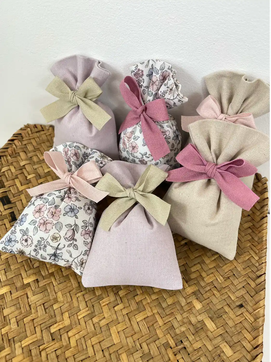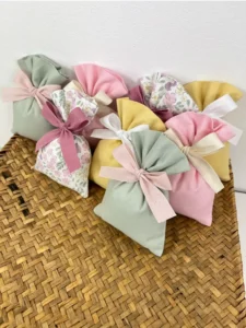 La combinazione di tessuti a tinta unita in tenui colori pastello e le fresche fantasie floreali creano un’armonia visiva perfetta per eventi all’aperto, temi shabby chic o cerimonie classiche. Ogni sacchetto è rifinito con un nastro in tessuto che richiama i colori della natura, pronto per essere annodato a fiocco.