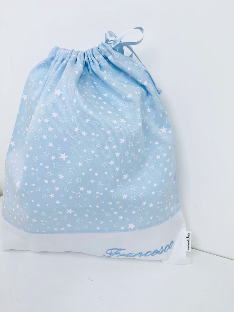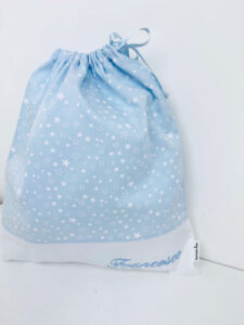 Sacco cambio realizzato a Mano con tessuto in cotone. Offre comfort e praticità sia alla mamma che al neonato. Da utilizzare come sacchetto dove riporre il primo cambio da portare in ospedale , per ricordare i primi giorni del neonato, ma utilizzabile anche in futuro come porta cambio per l’asilo.